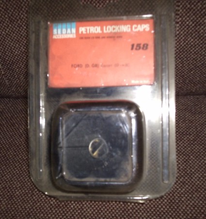 petrol cap2.jpg (51037 bytes) Genuine 70s 'Sedan' brand plastic locking petrol cap for early Escort (inc. Twin Cam). Spins when locked.