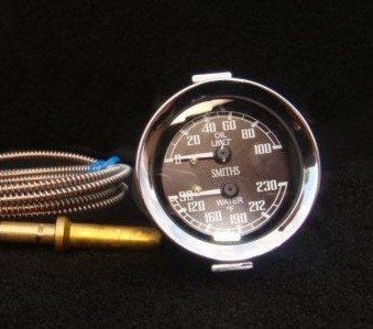 SMITHS Oil Pressure/Water Temperature Gauge As used in most/all works Escorts. 52 mm diameter with chrome bezel. White figures on a black dial. Oil pressure from 0 to 100 lbs per square inch. Water temperature from 90 to 230 degrees F. With 12 volt illumination. |